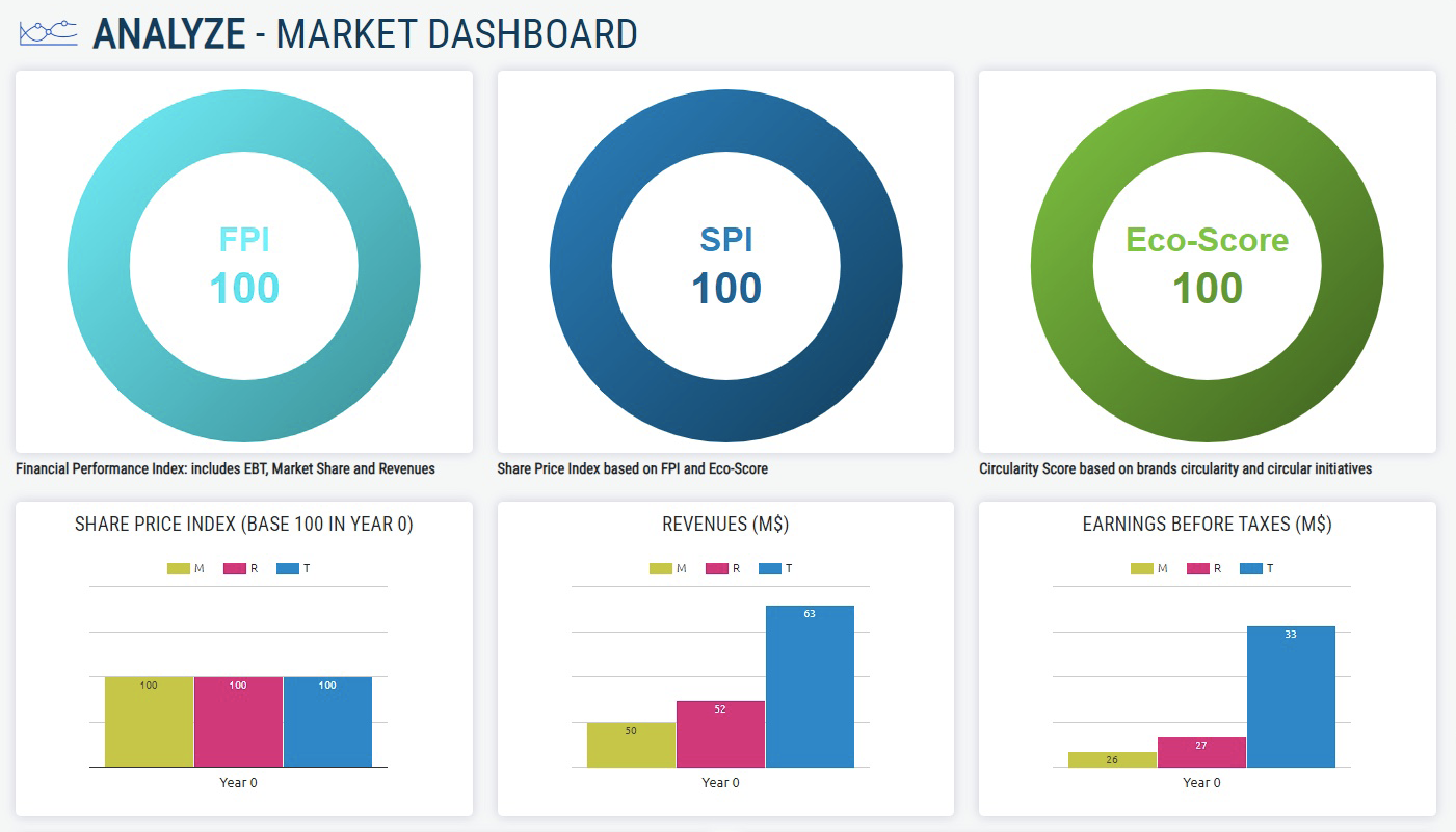 Évaluer les performances à l'aide d'un indice de prix des actions (SPI). Pour réussir, les équipes doivent prendre des décisions afin d'optimiser leur indice de prix des actions, qui comprend les performances globales de l'entreprise (indice de prix financier). Mais elles doivent également prêter attention à leur Eco-Score, qui mesure les caractéristiques de durabilité d'une marque et les initiatives circulaires de l'entreprise.